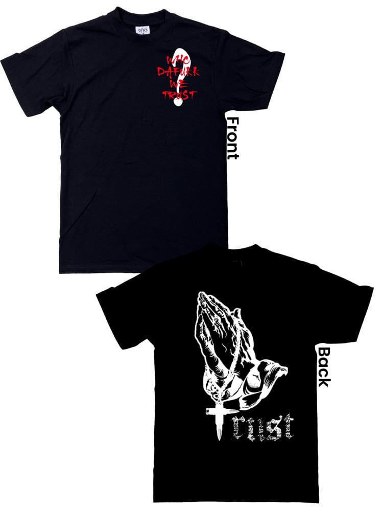 Crafted from premium heavyweight cotton (for the tee) and ultra-soft fleece (for the hoodie), this drop delivers both comfort and confidence. The front hits hard with bold red typography layered over a white question mark — a visual challenge to loyalty. On the back, praying hands clutching a dagger cross remind you that trust cuts both ways.